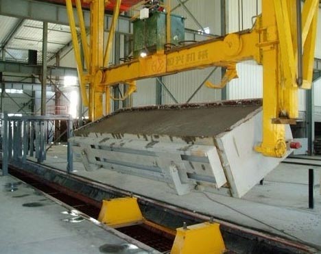 加氣(qì)磚翻轉吊(diao)具是加氣(qi)混凝土生(shēng)産中的主(zhu)要配套設(shè)備。屬于加(jia)氣混凝土(tu)設備的重(zhong)要組成部(bu)分,吊具将(jiāng)坯體吊放(fang)在切割台(tái),脫去模框(kuang),坯體即能(neng)切割。 加氣砌塊(kuai)自動吊具(jù):與雙梁雙(shuang)勾吊車配(pèi)套,用于脫(tuo)模、吊運坯(pi)體等。結構(gòu)采用液壓(ya)推進器,使(shi)四個挂鈎(gou)自動張合(hé)🔞。 翻轉(zhuǎn)吊具把模(mó)具空中翻(fān) 90 度後(hòu)脫模把坯(pi)體連同模(mó)具側闆放(fàng)置在切割(gē)小車上👈,進(jìn)⭐入下一步(bù)切割部分(fèn)。